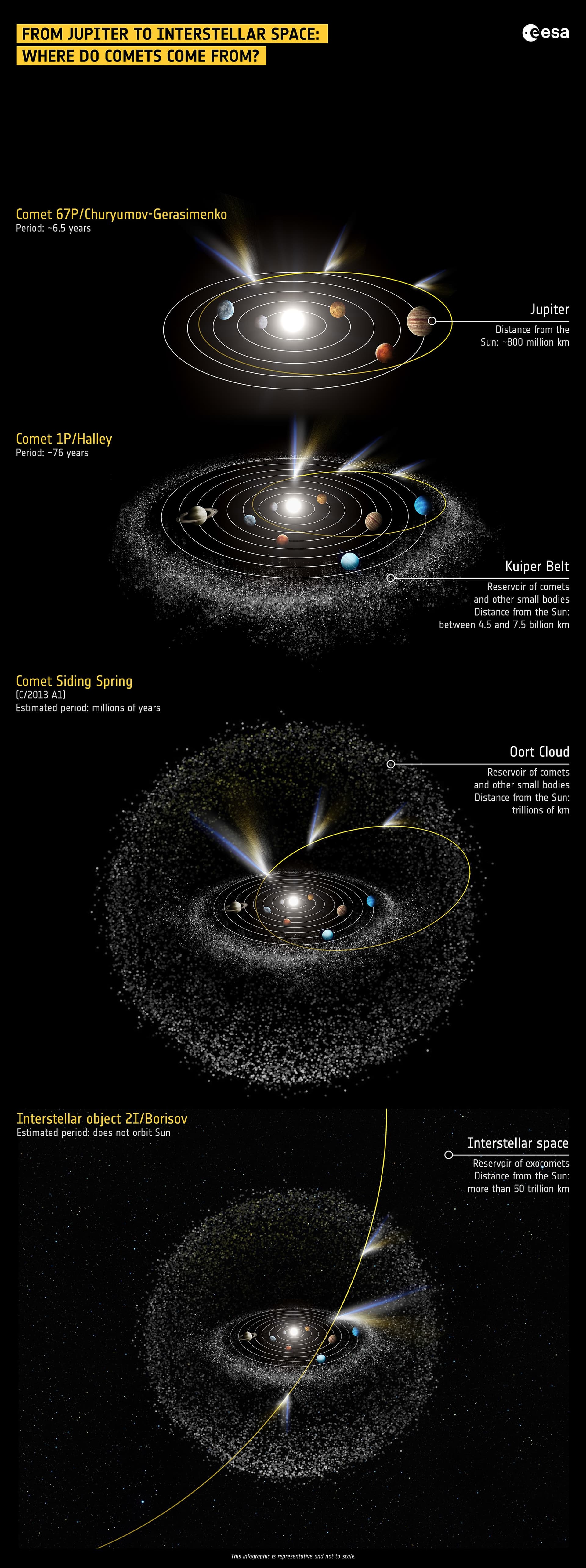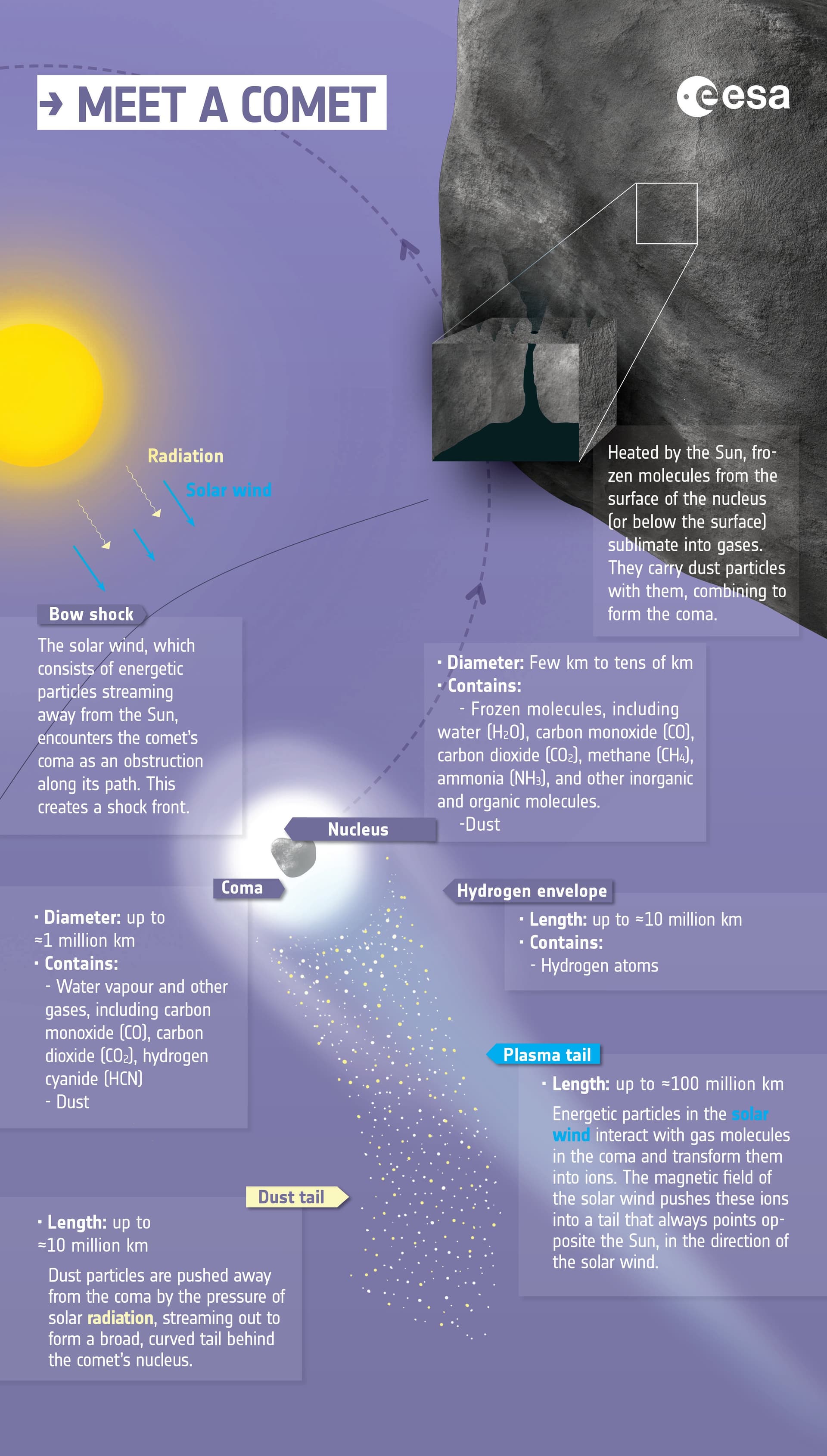 The icy relics of the solar system are composed of rock, gravel, dust, and frozen molecules, such as carbon dioxide, carbon monoxide, methane, ammonia, and water. Once close to the sun, these compounds sublimate into gases, creating a fuzzy cloud that earned the comets another nickname in history: hairy stars.