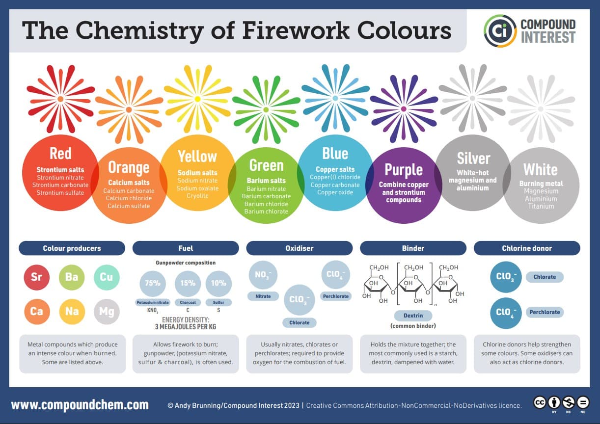 Fireworks are devices filled with explosive chemicals used for celebratory purposes. They are classified as display—used by licensed professionals—or consumer—used by the general public—but both get their propulsion and explosion from gunpowder.